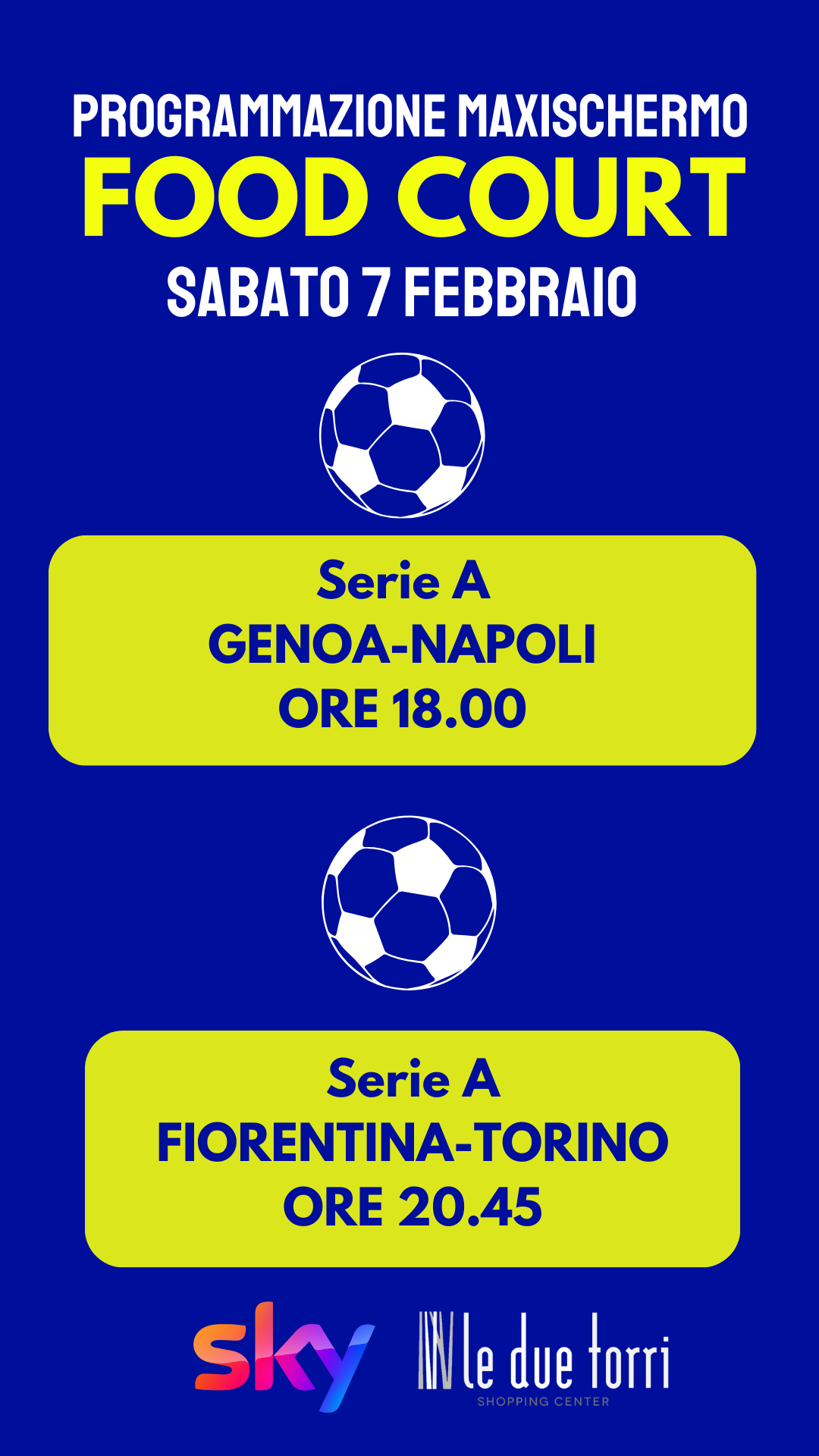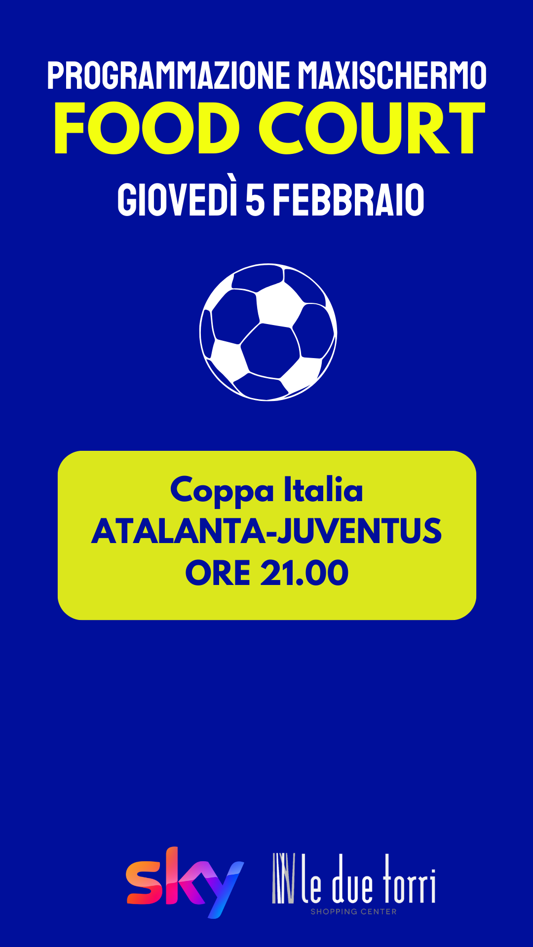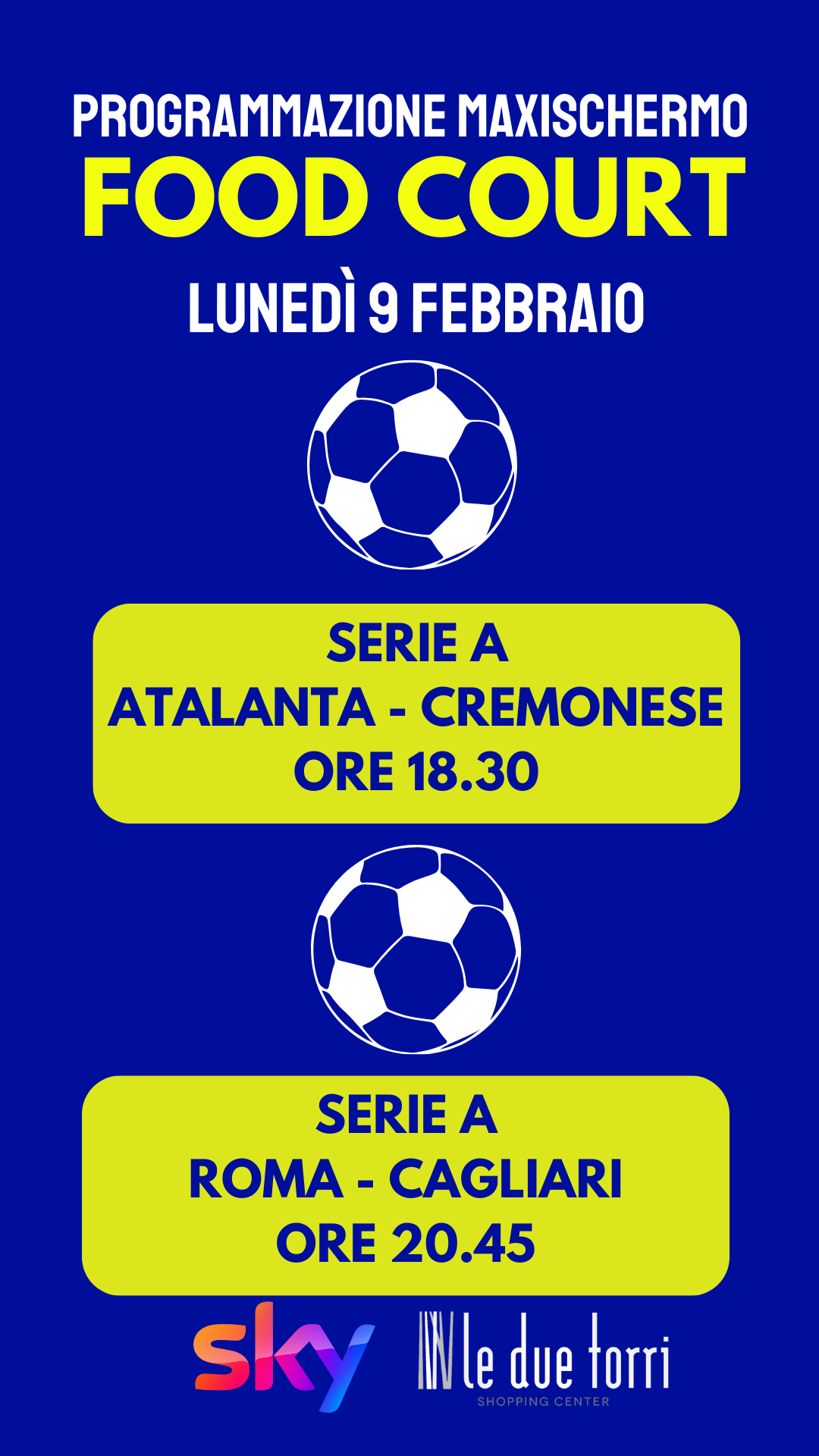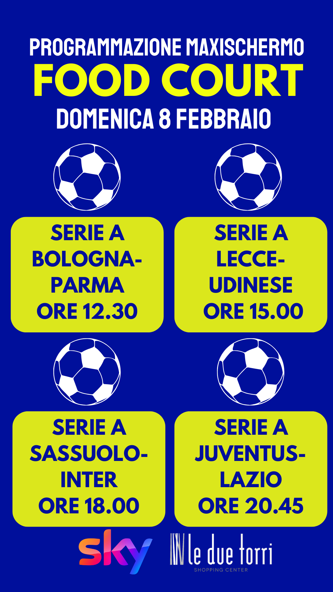 Alla Food Court de Le Due Torri ti aspetta una ricca programmazione di eventi sportivi, tutti visibili sul nostro Maxischermo! Vieni a passare un momento di condivisione assieme ai tuoi amici, colleghi o alla tua famiglia!