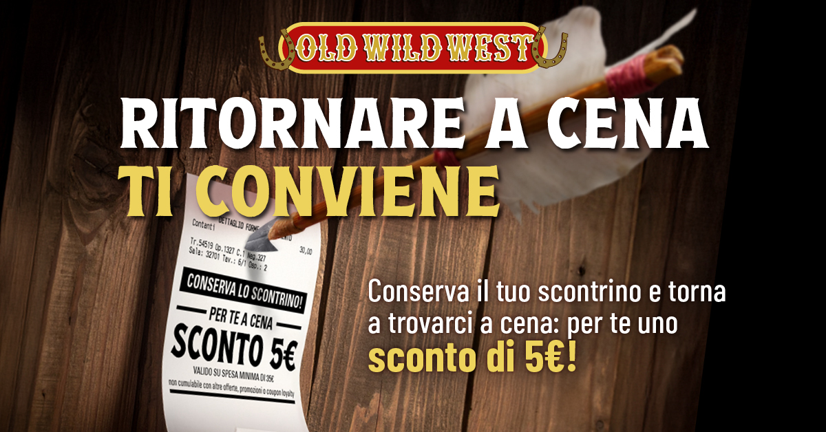 Da Old Wild West fino al 19 ottobre sul tuo scontrino troverai un buono sconto di 5€ su una spesa minima di 35€, valido a cena entro 2 settimane dalla data di emissione ????✨